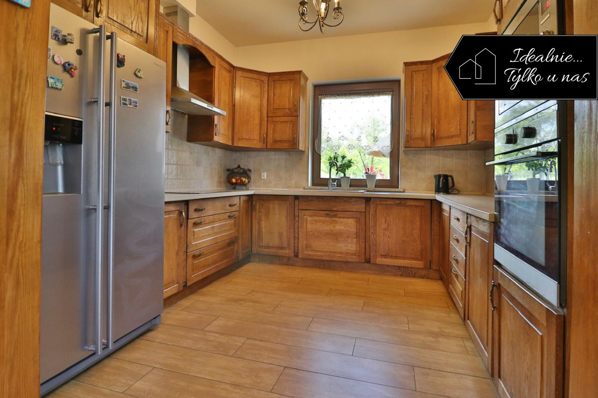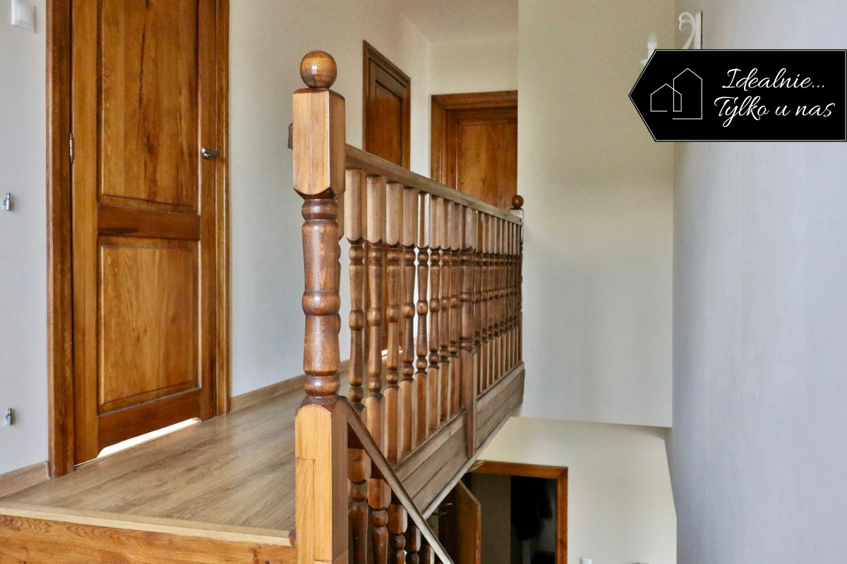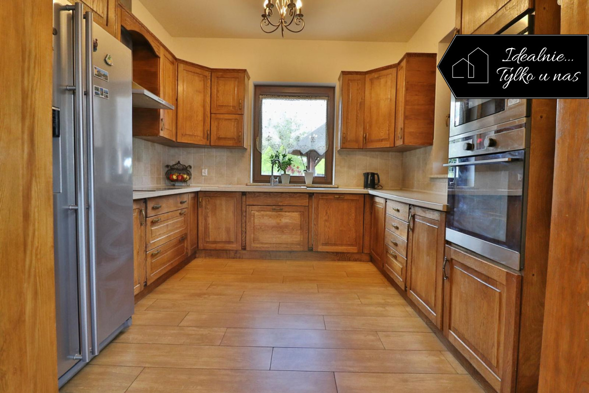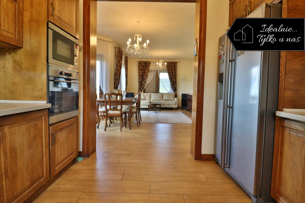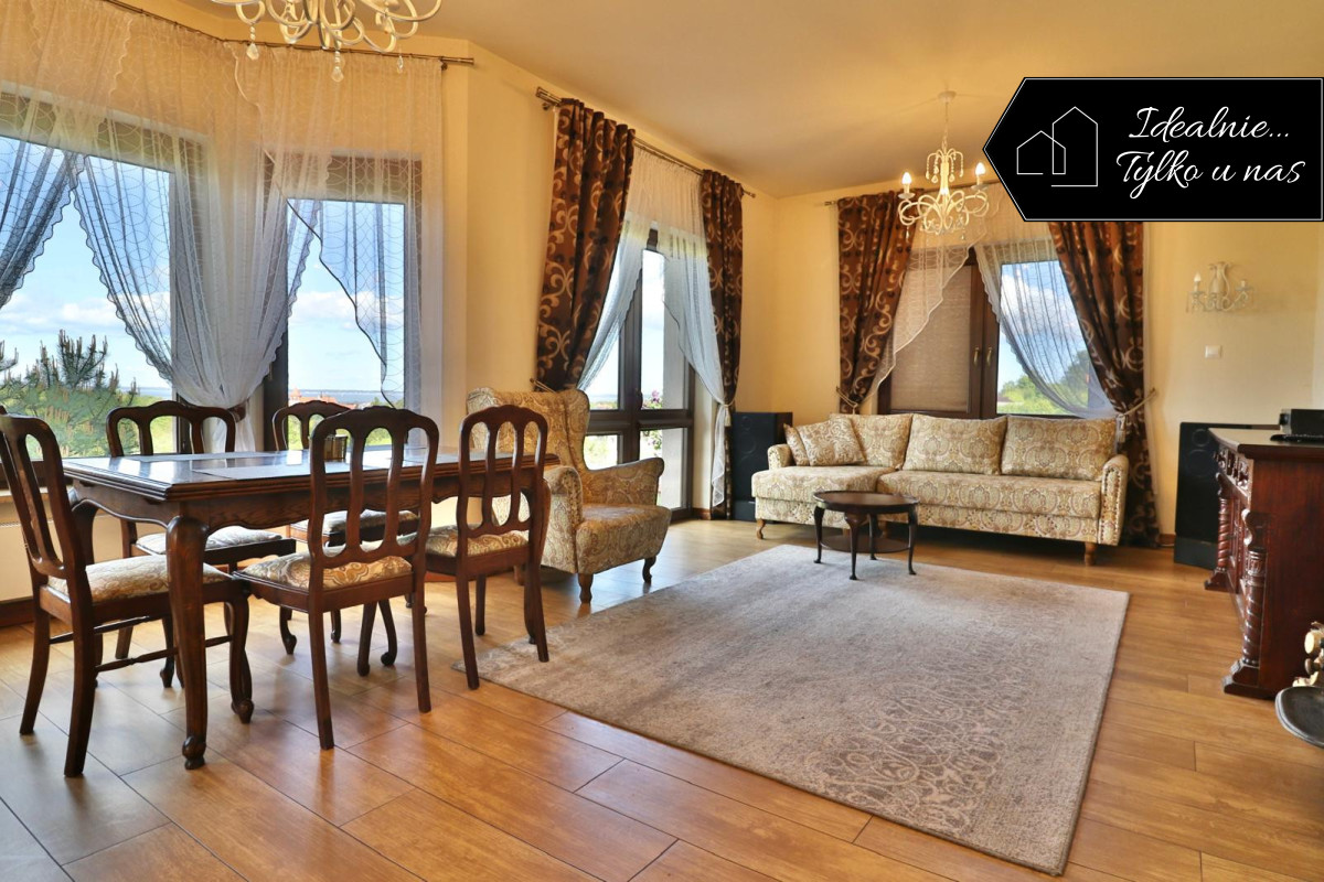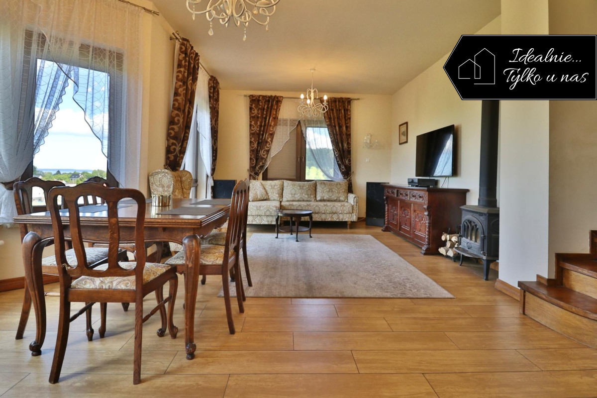 Wnętrze zostało zaprojektowane z dbałością o detale i wysoką jakość wykończenia. Dom składa się z 5 przestronnych pokoi, 2 eleganckich łazienek, garderoby, suszarni oraz garażu. Salon z kominkiem, klimatyczna jadalnia, funkcjonalna kuchnia w drewnie oraz przemyślane układy pomieszczeń zapewniają komfort codziennego życia.