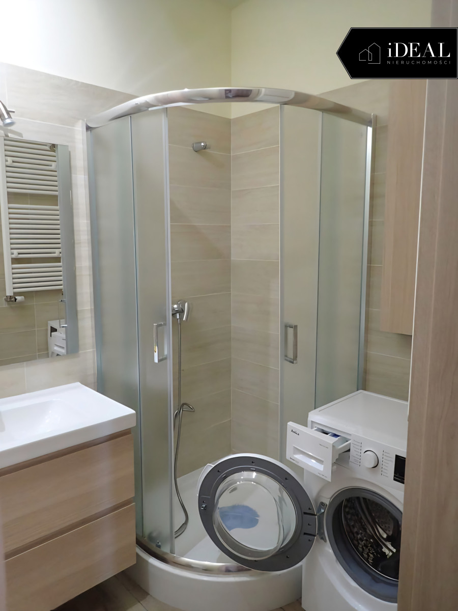 Łazienka - prysznic, pralka, zabudowa meblowa.