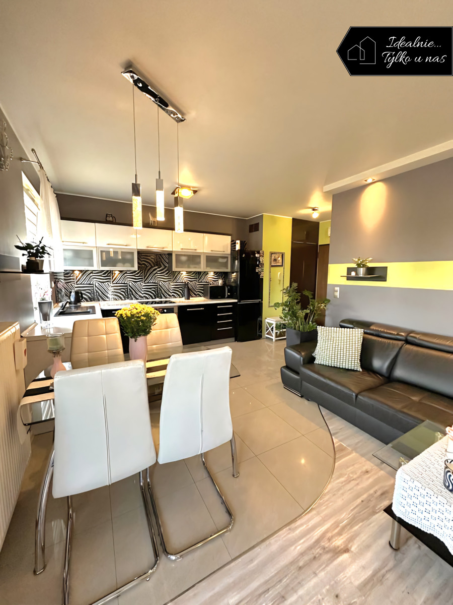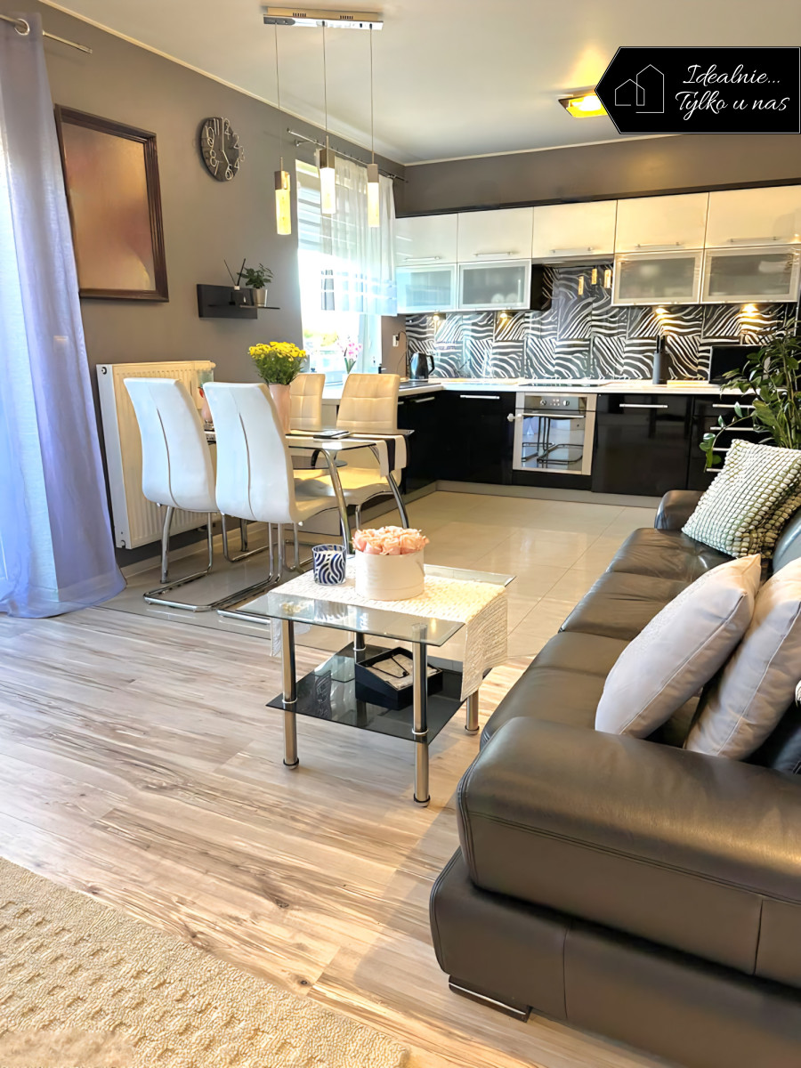 Przestronny salon z aneksem kuchennym - dobrze doświetlony, z wygodną częścią wypoczynkową