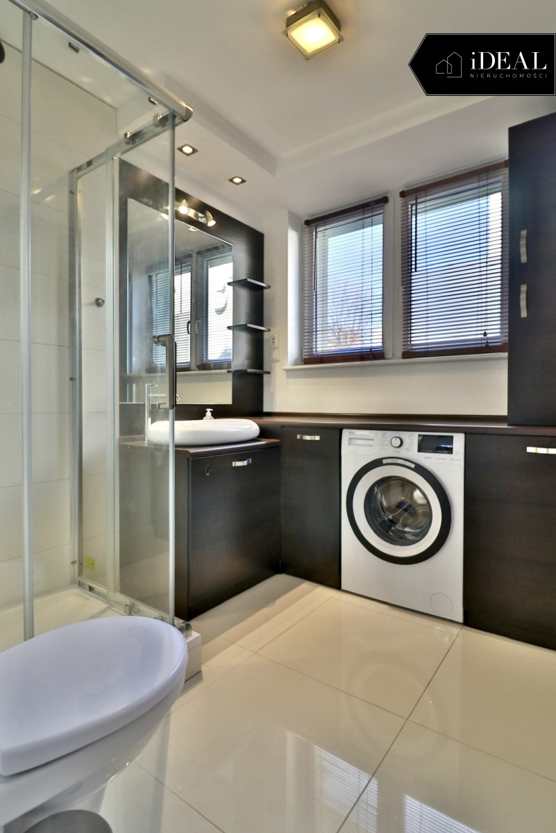 łazienka z oknem - kabina prysznicowa, pralka, szafki do przechowywania,